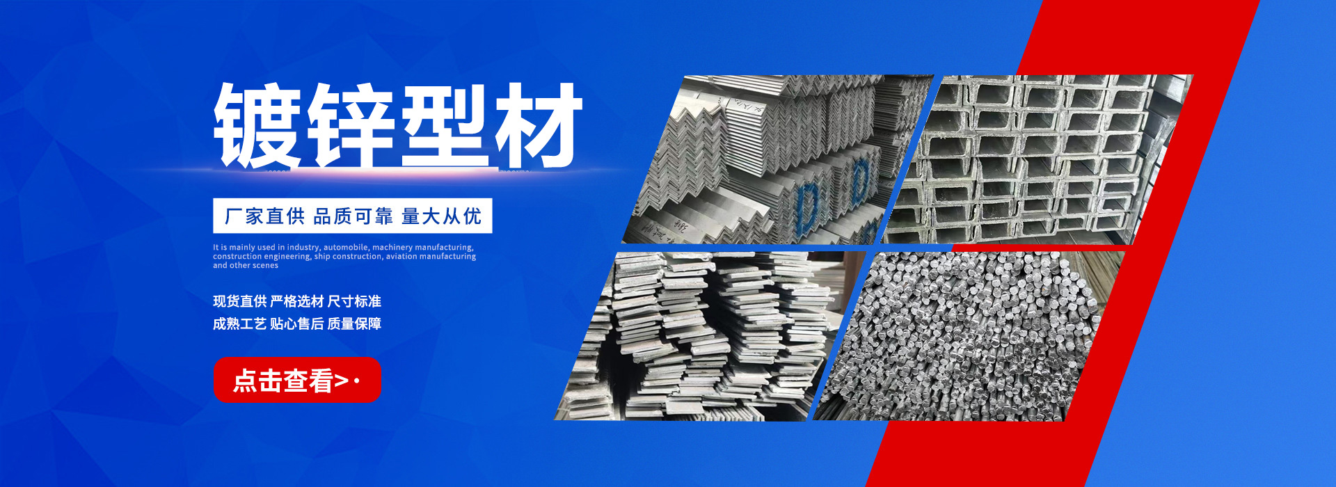 天津恒泰廣業鋼鐵有限公司是一家從事鋼鐵流通企業。本公司經過多年的努力已在華東、華北、華南地區建立起良好的信譽,不僅在同行市場營銷上取得成績,而且將直銷作為公司主要銷售模式,為直接用戶提供優惠價格、合格品質的鋼材資源,直接降低了廣大用戶的采購成本,贏的廣大鋼材采購商的信任。 天津恒泰廣業鋼鐵有限公司主營大棚管,鍍鋅管,鍍鋅方矩管,鍍鋅帶圓管,鍍鋅帶方矩管,鍍鋅H型鋼,鍍鋅角鋼,鍍鋅槽鋼,鍍鋅扁鋼,鍍鋅圓鋼等.供應溫室大棚,幕墻公司,公路設施,鋼構工程用材, 產品規格范圍: 鍍鋅鋼管4分-10寸,鍍鋅方管:20*20—800*800,選擇天津恒…